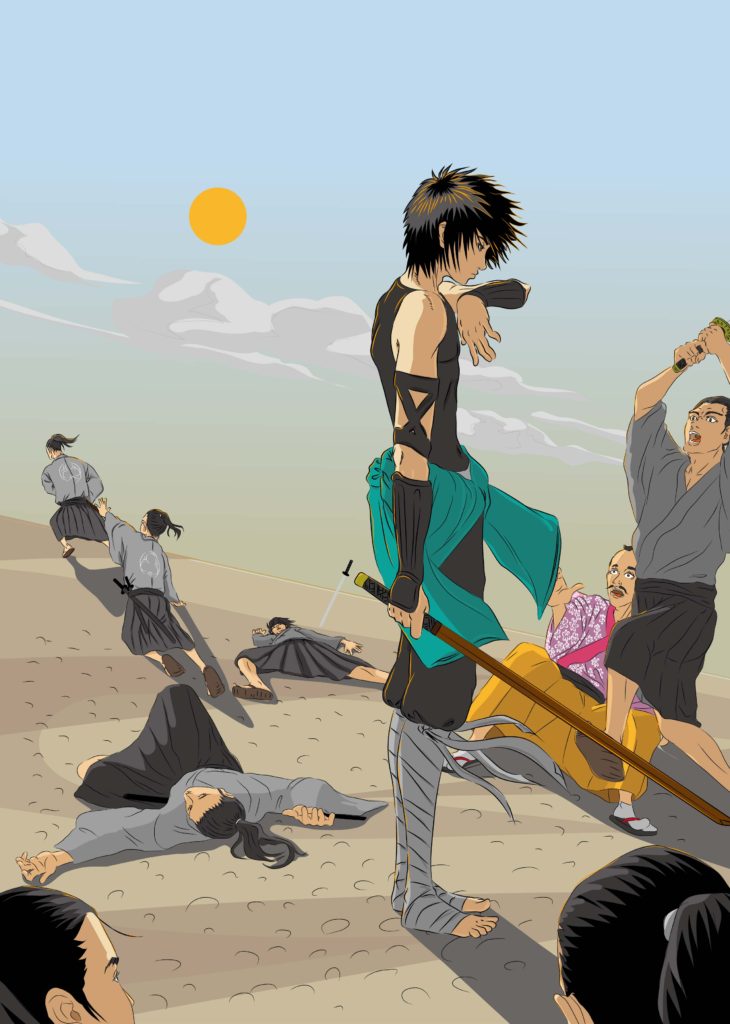 護衛人を薙ぎ払い青年に怯える主人。